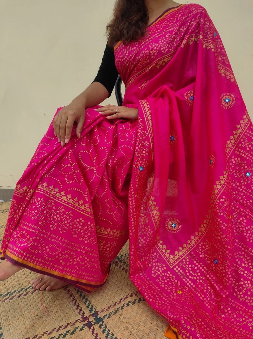 রেশম সিল্ক চুনরি ব্লক প্রিন্ট শাড়ি