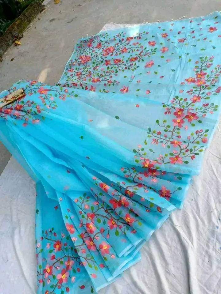 হাফসিল্ক শাড়ীতে হ্যান্ডপ্রিন্ট তুলির কাজ করা
