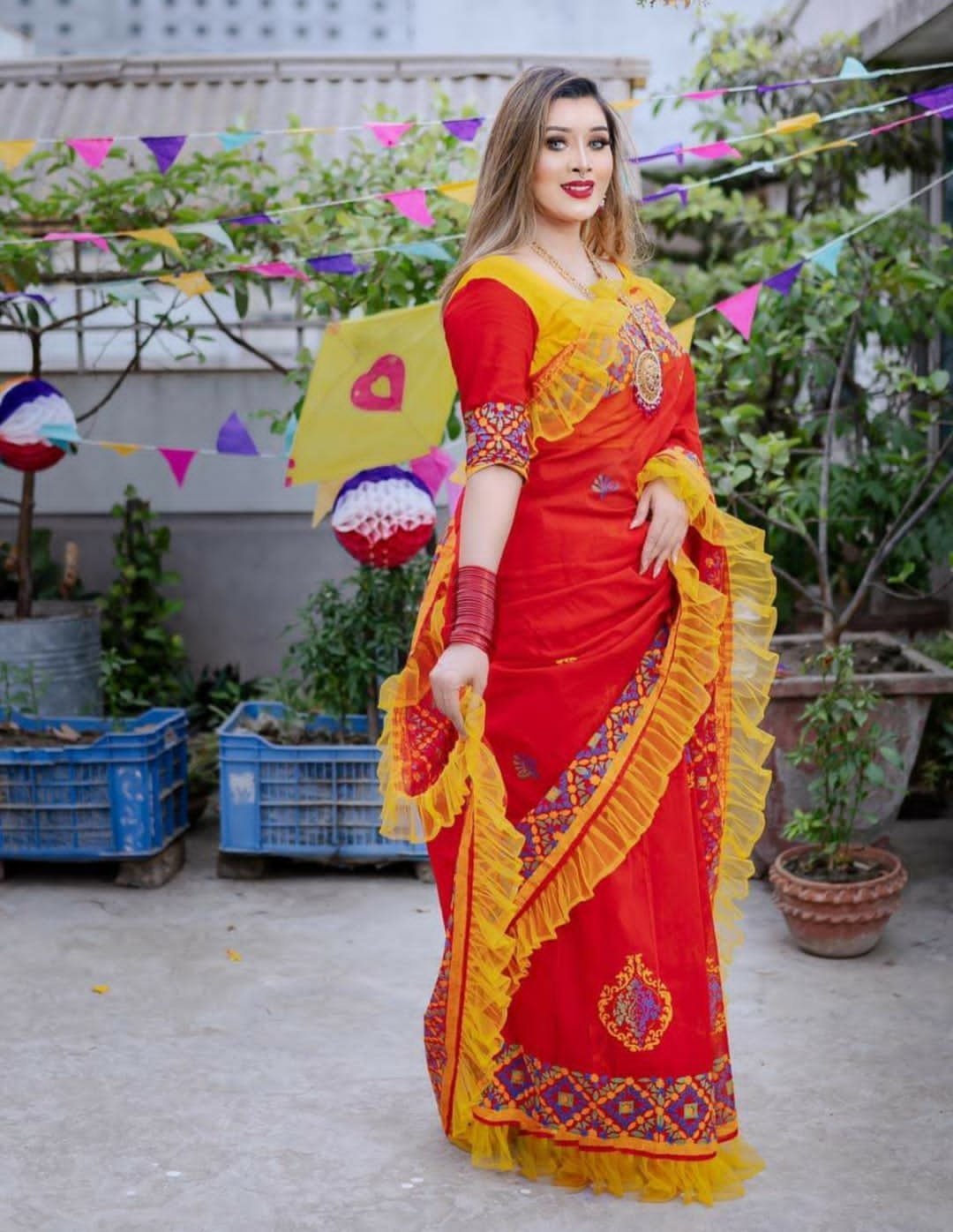 মিডিয়াম কোয়ালিটির আকর্ষণীয় বাজেট ফ্রেন্ডলি শাড়ী, যেকোনো ধরনের প্রগ্রাম বা উৎসবে পড়ার জন্য বেস্ট।