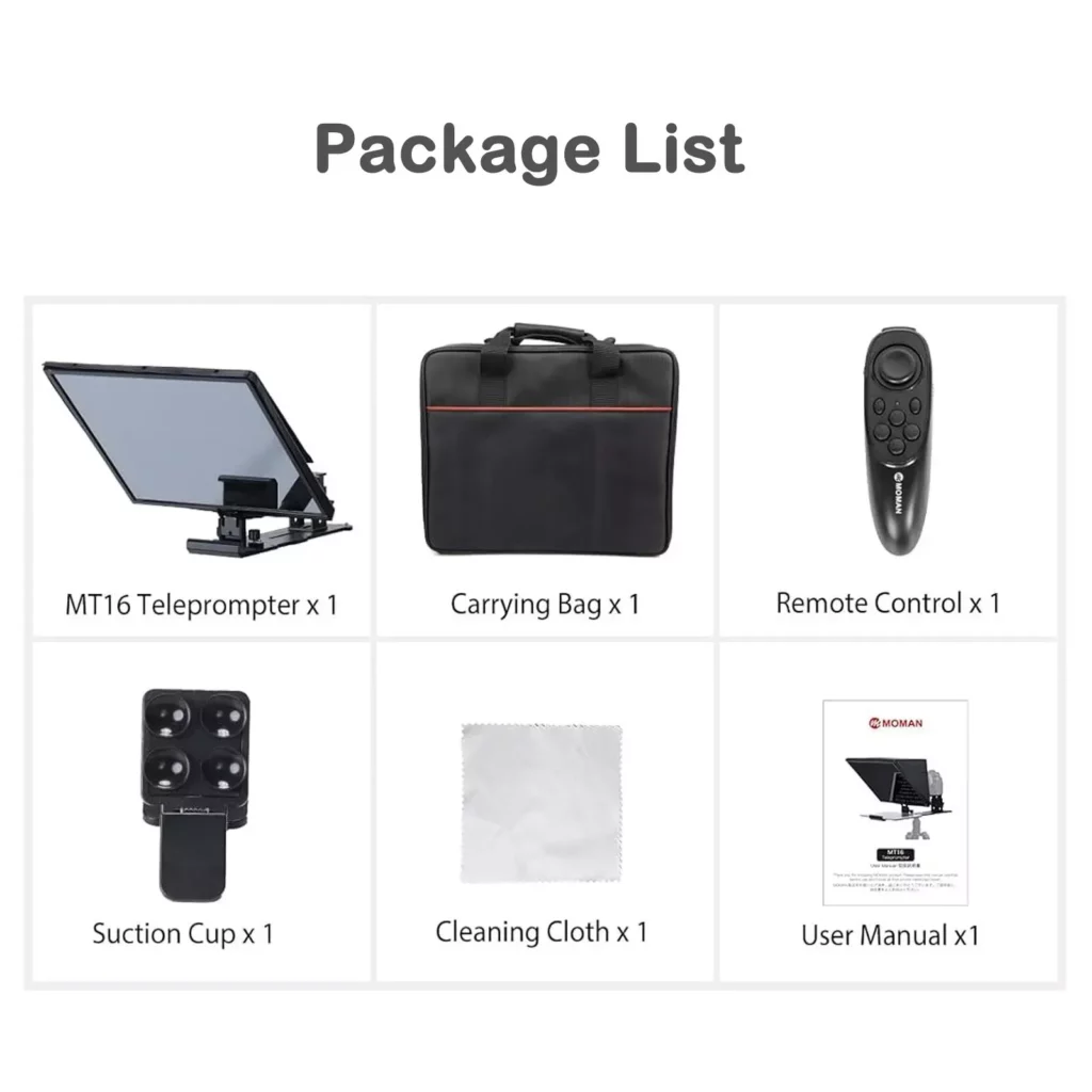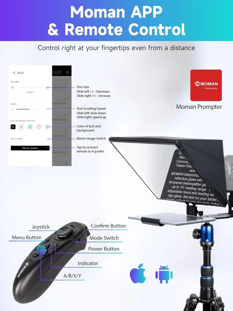 • Remote Control & APP Integration: Works with the Moman Prompter APP to adjust font size, scrolling speed, and more.